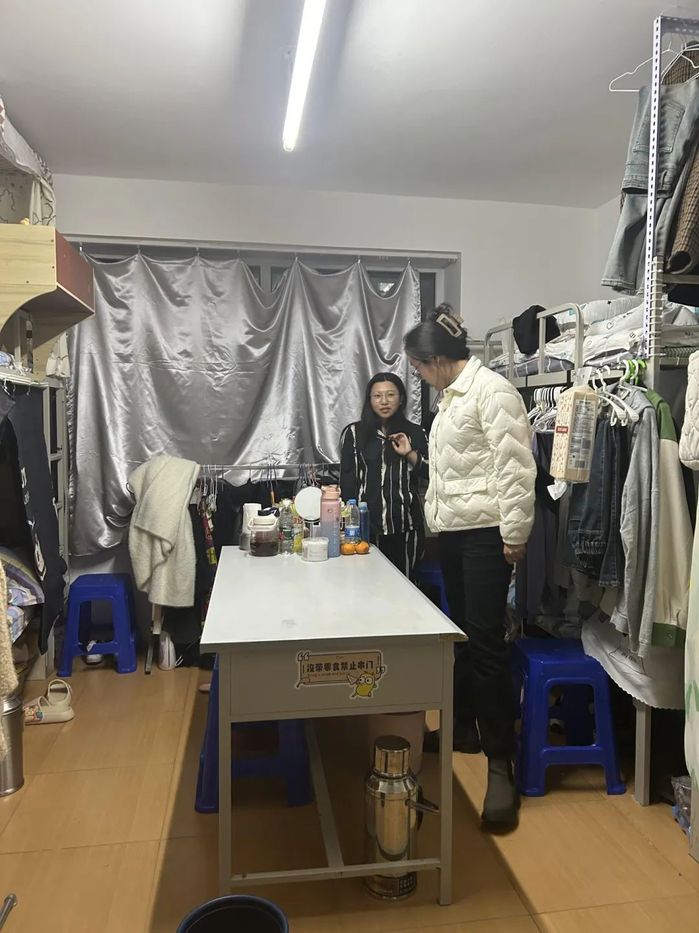 在检查过程中,刘芳芳带领辅导员深入各个公寓楼层,对员工宿舍的内务和用电情况也一并做了详细走访。她提醒所有同学要时刻注意用电安全,明确要求大家不得使用违规电器,做到人走断电,确保电器在不用时能够及时关闭,避免造成安全隐患。