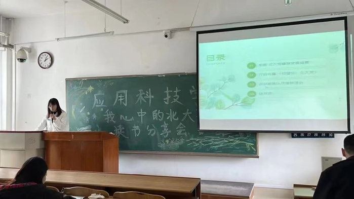 同学们运用多种方式分享自己在读书中的感悟与收获,活动现场气氛热烈。其中,商月分享了著作《仰视你,北大荒》,讲述了新中国成立75年来北大荒服从国家利益、服务国家战略,成为“中华大粮仓”的光辉历程;李莹分享了人物传记《梁军传》,与大家一起回顾新中国第一位女拖拉机手梁军的故事。她号召同学们像梁军一样,突破自己、勇于创新、坚持不懈做好每一件事。王莹分享了作品《风雪人间》,向同学们展示了主人公丁玲自1985至1970年间在北大荒农场的生活片段。