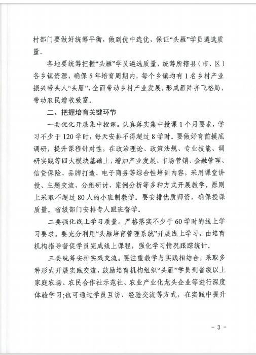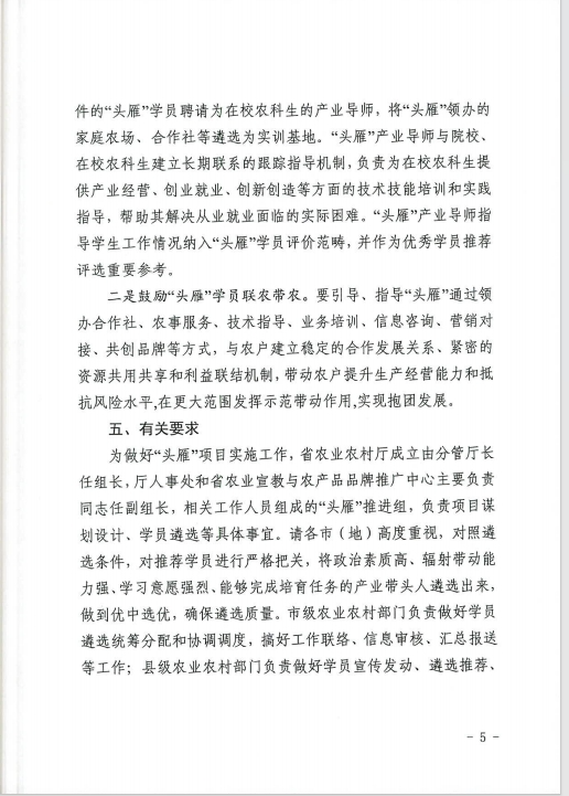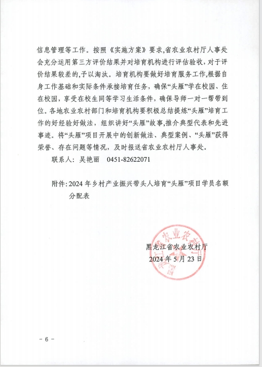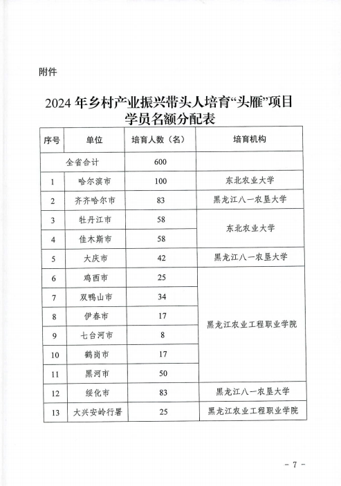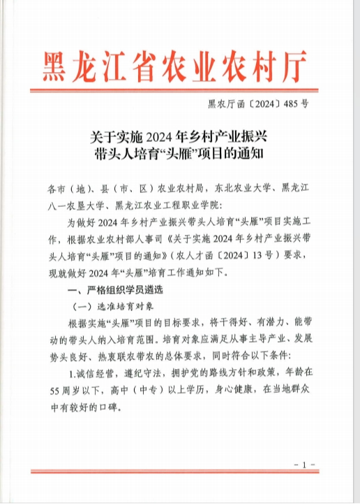 近日,黑龙江省农业农村厅下发《关于实施2024年乡村产业振兴带头人培育“头雁”项目的通知》(黑农厅〔2024〕269号),公司成功遴选为黑龙江省2024年乡村产业振兴带头人培育“头雁”项目培育机构,未来公司将承担齐齐哈尔市、大庆市、绥化市208名“头雁”培育工作,为保证培育质量,每名学员配备专项资金2万元,共计416万元。