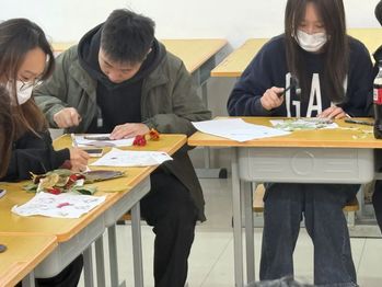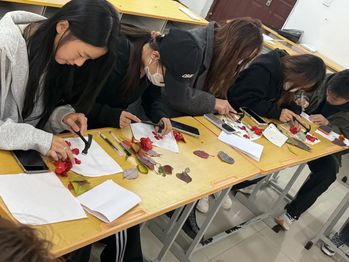 随后,同学们开始动手制作自己的拓染作品。从挑选植物、处理布料,到敲打拓染、固定作品,每一步都充满了挑战与乐趣,大家或低头沉思,或相互交流,都沉浸在这份独特的艺术创作中。在创作过程中,参与者们充分发挥了自己的想象力与创造力,有的选择了清新脱俗的花朵,有的则偏爱坚韧不拔的叶片,通过敲打与挤压,植物的色彩与纹理逐渐在布料上显现,形成了一幅幅独一无二的拓染作品,这些作品不仅记录了植物的美丽与神奇,更承载了参与者们对大自然的热爱与敬畏。