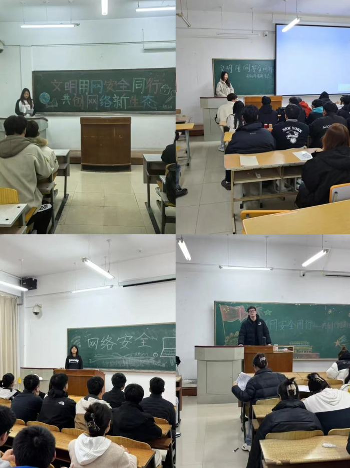 班会过程中,各班团支部书记首先介绍了网络安全重要性,通过列举生动的案例,围绕老员工的日常生活中的网络安全问题,从个人信息及密码安全防护、识别与抵制不实信息传播、警惕网络诈骗与不良行为、网络安全工具与资源分享、网络社交互动与人际关系等9个方面,提醒同学们要做到文明用网、安全上网,防范潜在的风险,全方位提升网络安全意识。