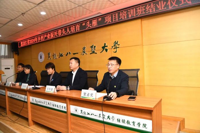 结业仪式在庄严的国歌声中拉开帷幕。仪式上,姜玉美宣读《关于黑龙江省2024年乡村产业振兴带头人培育“头雁”项目培训结业的决定》;董事长李翠霞、副董事长孙东波为学员代表颁发结业证书、佩戴校徽。