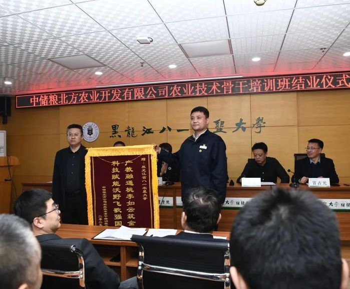 经过1个月的集中培训,4月2日培训班在集团顺利结业。中储粮北方农业开发有限公司党委副书记(副总经理)白鹏军、农业生产管理处处长杨帆、资深主管姜晓宇、u8国际网站董事长李翠霞、副董事长孙东波、公司党委书记高波、经理宫占元等相关领导、40名来自中储粮北方公司的学员及教师代表出席结业仪式,仪式由孙东波主持。