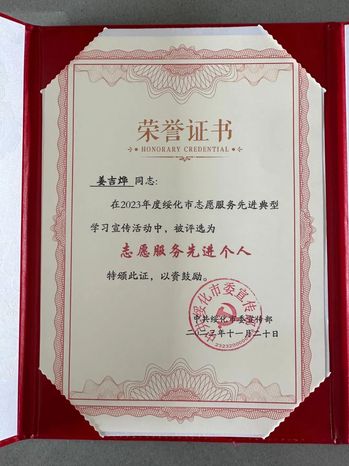 他积极投身志愿服务,用行动诠释奉献精神。从高考结束立即投身社区疫情防控,到除夕夜坚守在入城卡口防控一线,他始终冲在抗疫最前沿;从寒冬庆元的研途送暖,到哈尔滨街头助力亚冬会,处处都有他忙碌的身影。他共参与志愿活动706 次,服务时长 2644 小时。他的努力与付出得到广泛认可,获评黑龙江省志愿服务联合会五星志愿者、省志愿者卓越金奖。他的抗疫事迹被 “龙头新闻”报道,获共青团绥化市委颁发的抗疫志愿者证书,先后三次获评县级优秀志愿者。