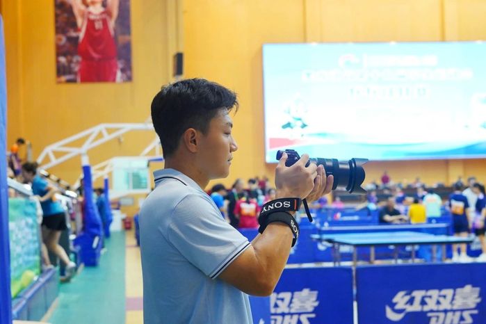 武术赛场上,少年的拳风卷起灰尘,他按下快门的瞬间,定格了“少年负壮气,奋烈自有时”;网球架下,运动员挥拍击球的刹那,他调整角度,让飞溅的汗珠与阳光一起入镜;教练员的目光追着运动员移动,他们悄悄调整焦距,想把“传承”二字,拍得更清晰些。