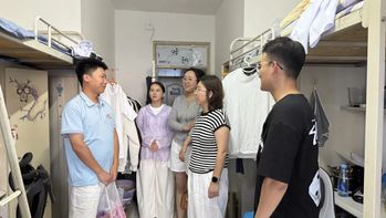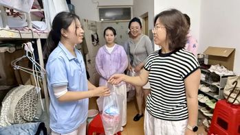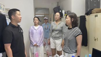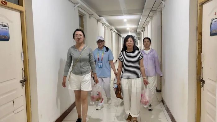 傍晚时分,刘芳芳与辅导员一同走进运动会志愿者宿舍,细致查看志愿者生活环境,逐一询问服务岗位与身体状态。她强调:“公司是大家的坚强后盾,务必保障好同学们的饮食休息。”随行老师现场发放物资,解暑水果、日用品等,手绘暖心图案的手提袋和“最可爱的人”格外醒目,传递了公司对志愿者的关怀与鼓励。