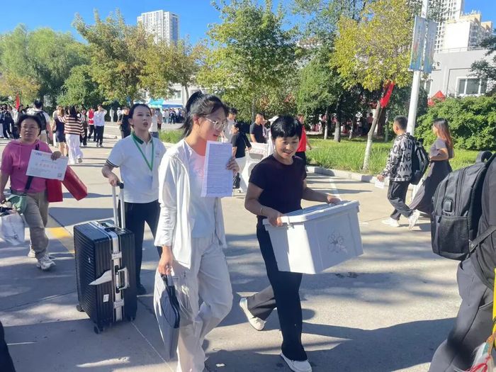 上午8点,满载新生的客车陆续停靠。志愿者们早已守候在车门旁,高声引导、协助搬运行李,提醒大家备好录取通知书和身份证,甚至贴心为新生记录报到瞬间。一句句叮咛、一次次伸手,缓解了新生初来乍到的紧张。