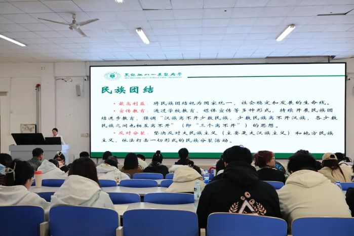 毛叶·阿拜首先为新生们系统梳理和讲解了我国的民族政策。她围绕民族平等、民族团结、民族区域自治等核心内容,结合具体事例,阐述了国家在促进各民族共同繁荣发展、保障各民族合法权益方面的重要举措和显著成就,引导同学们深刻认识到维护国家统一和民族团结的重要性。